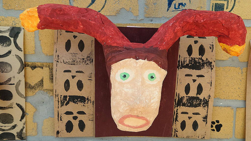 Nach dem Vorlesen der 58. Historie „Wie Eulenspiegel in Erfurt einen Metzger um einen Braten betrog“ und der 61. Historie „Wie sich Eulenspiegel in Braunschweig bei einem Brotbäcker als Bäckergeselle verdingte und wie er Eulen und Meerkatzen backte“ setzten die Schülerinnen und Schüler ihre Eindrücke im Lernbereich Plastik um: Aus Pappmaché entstanden Halbreliefs von Till Eulenspiegel, welche durch Drucke von Braten, Würsten, Eulen und Meerkatzen um Eulenspiegel ergänzt wurden.