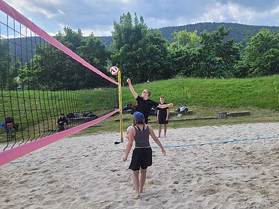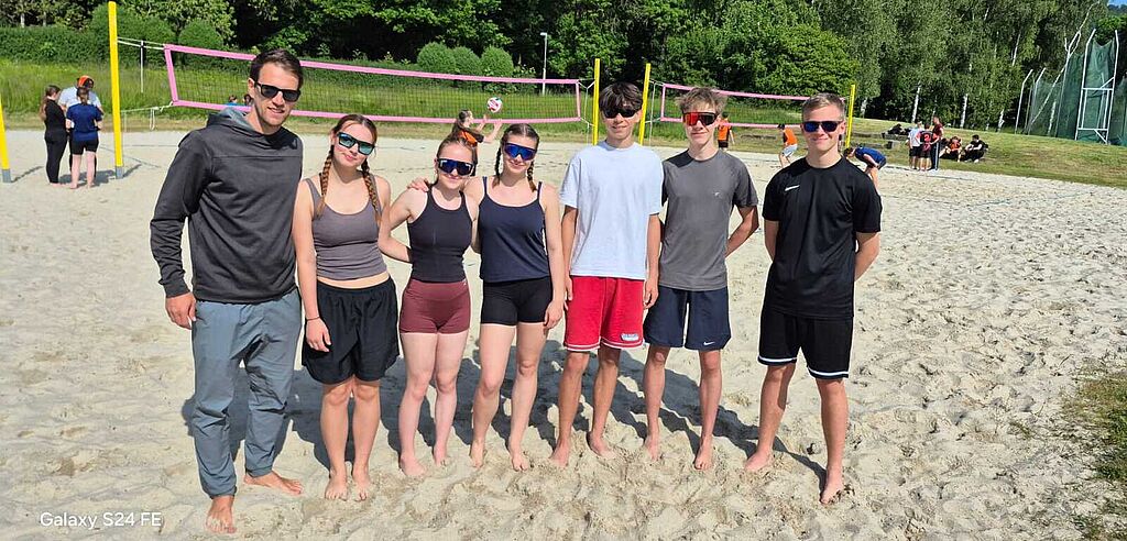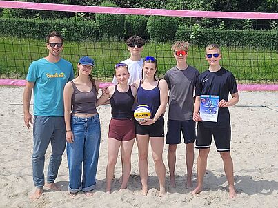 Damit kam es auf dem Mixed-Feld zum Showdown um den Turniersieg. Nachdem es nach den ersten beiden Sätzen ausgeglichen stand, musste der dritte Satz die Entscheidung bringen. Am Ende hatten wir das Glück der Tüchtigen auf unserer Seite und konnten das sehr enge Spiel mit 15:13 für uns entscheiden. Im Anschluss war der Jubel und die Freude über den Sieg sowie das Erreichen des Schulamtsfinales groß. Dieses findet am 10.06.25 im Freibad von Schmalkalden statt, welches auch als die "Schmallediven" bezeichnet wird.