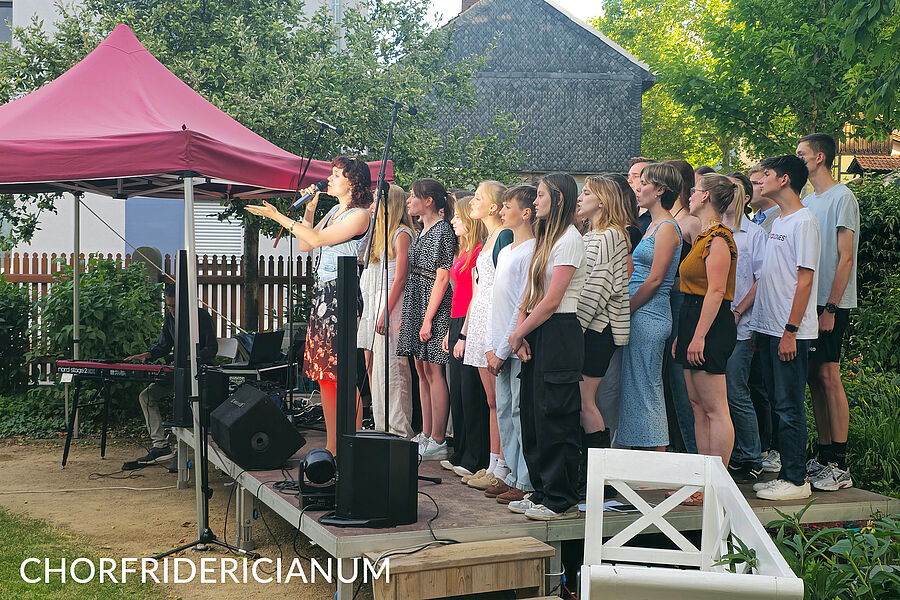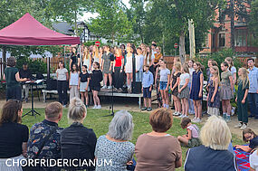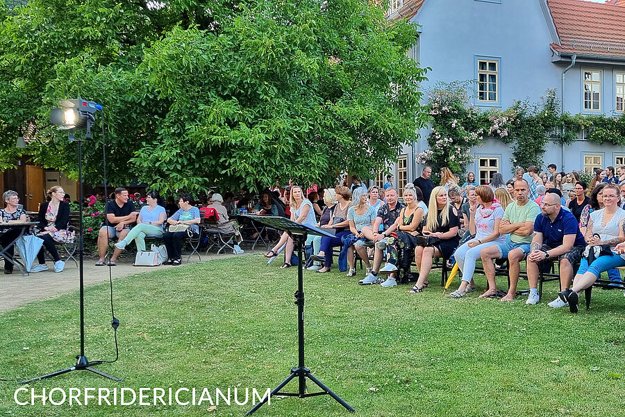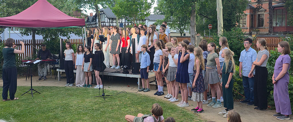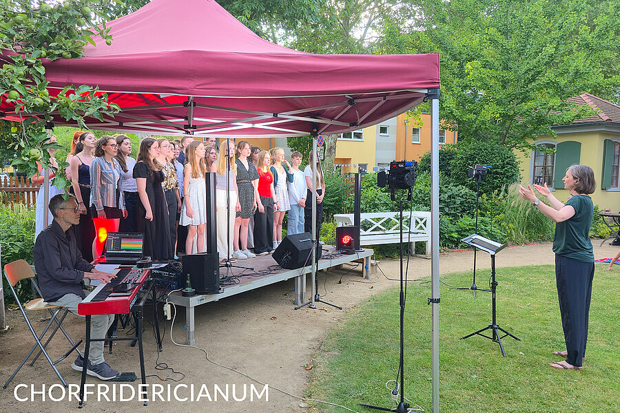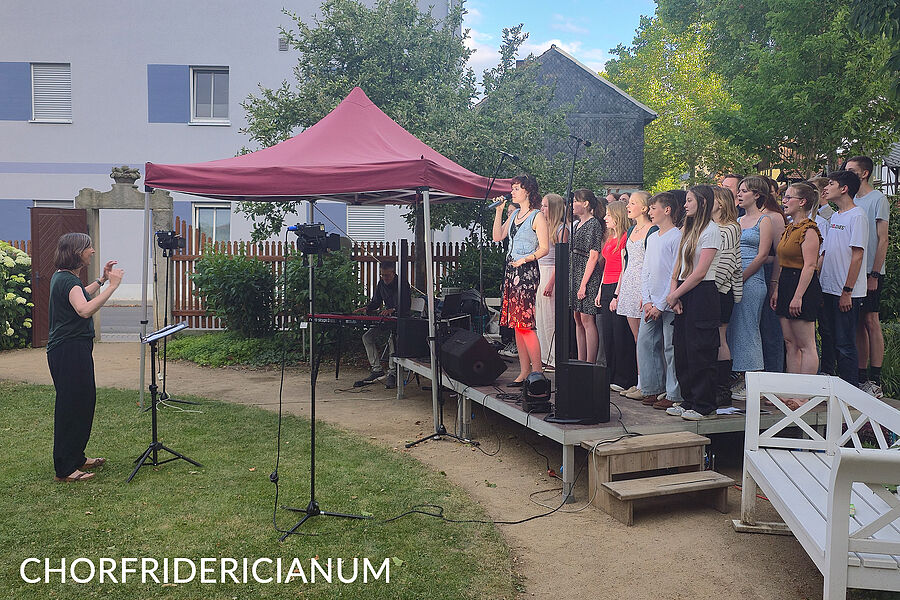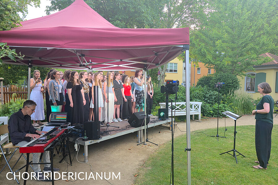 Am Ende des Schuljahres veranstalteten die beiden Chöre des Fridericianums ihr Chorabschlusskonzert im schönen Ambiente im Garten des Schillerhauses. Im letzten Jahr mussten die Chöre witterungsbedingt leider kurzfristig in die Aula des Fridericianums ausweichen. In diesem Jahr sollte aber - trotz Unwetterwarnung - das Konzert unbedingt wieder Open Air stattfinden.