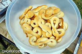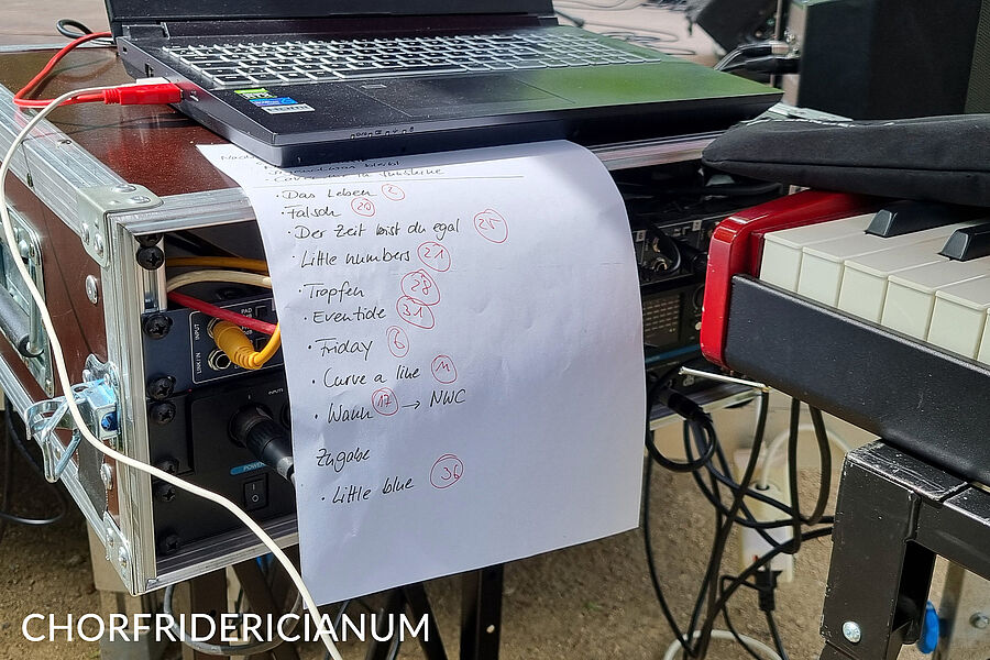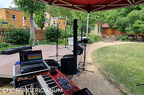 Der Aufbau in mittäglicher Hitze verlief reibungslos - am Nachmittag versammelten sich die Choristen beider Chöre zum Kaffeetrinken und zum Soundcheck. Noch waren alle bester Stimmung und voller Vorfreude. Doch noch während der Soundcheck lief, kam ein heftiges Unwetter auf, die Technik musste schnellstmöglich gesichert werden. Trotzdem fiel auf der Bühne der Strom aus - die entsprechende Sicherung konnte nicht schnell genug gefunden werden. Etwas Hektik kam auf.