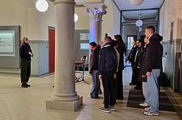 In dem Podcast geht es um eine Zeitreisende, die ins Jahr 1939 zurückreist. Dort trifft auf sie einen jüdischen Schüler, der an unserer Schule lernte und erlebte, wie sich sein Leben und der Schulalltag durch Ausgrenzung und Angst verändern.