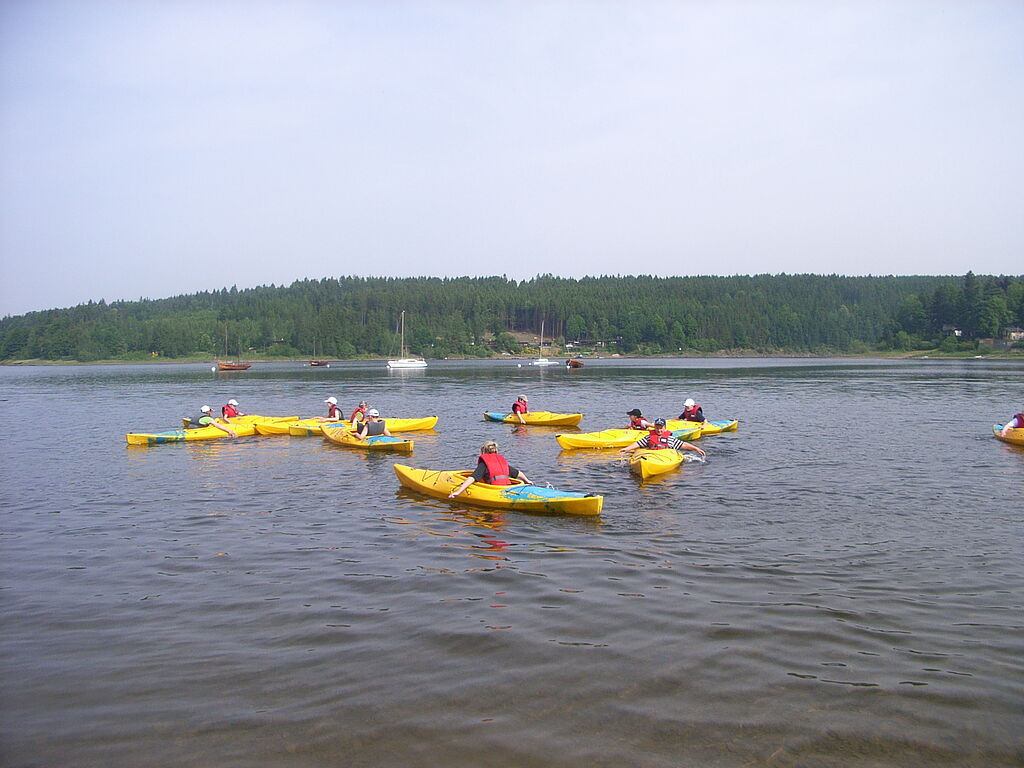 Ein weiterer Programmpunkt war „Kajak“ fahren. Am Anfang schien es schwer, aber nachdem wir ein paar Tricks angewendet hatten, lief es schon besser. Zur Ausdauerschulung fuhren wir eine „kleine“ Runde und kamen nach ca. 2 Stunden durchnässt und, auf Grund des kühlen Wetters und des „nassen“ Wassers, fast erfroren wieder am Ufer an. Eigentlich wollten wir einfach nur noch eine heiße Dusche. Aber nichts da. Wir mussten erst noch die Kajaks putzen und sie in den Bootsschuppen tragen. Zuerst die Arbeit – dann das Vergnügen.