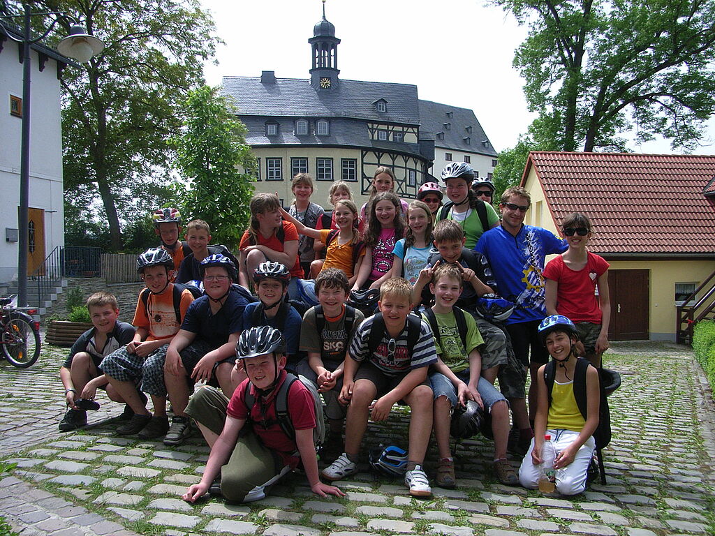 Das Ziel der Mountainbiketour hieß Schloss Burgk. Schon nach den ersten fünf Kilometern der Fahrradtour waren wir kaputt und wollten nicht wissen, was wir noch vor uns hatten. Es blieb dabei. Entweder bergauf oder geradeaus. So lernten wir die richtigen Gänge zu benutzen und unsere wenigen Kräfte besser einzuteilen. Wenn es doch einmal einen Berg herab ging dann so steil, das viele Schüler schieben mussten. Einige trauten sich aber auch die richtige Fahrtechnik anzuwenden und schafften die schwierigen Passagen. Nach einer halbstündigen Pause mit Burgbesichtigung fuhren wir einen anderen, kürzeren Weg zurück. Es lief nicht besser obwohl es nur bergab oder geradeaus ging. Da wir mit unseren Kräften am Ende waren, kam es uns vor, als ginge es nur bergauf. Endlich am SEZ angekommen, mussten wir wieder zuerst unseren Pflichten nachgehen - die Fahrräder putzen. Danach hatten wir endlich unsere verdiente Freizeit und durften uns geschafft aber glücklich in das kühle Nass der Talsperre stürzen. An diesem Abend schliefen wir schneller als sonst ein, was „wahrscheinlich“ an der Fahrradtour lag.
