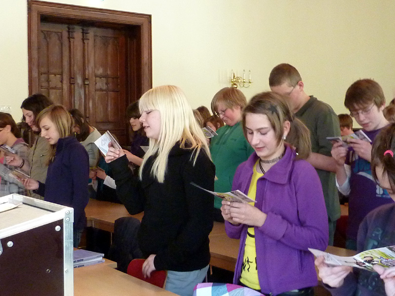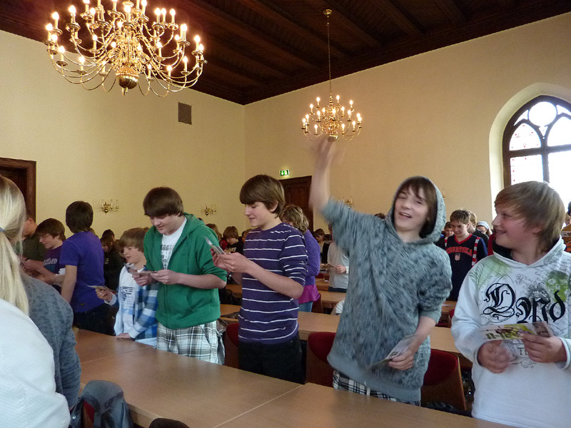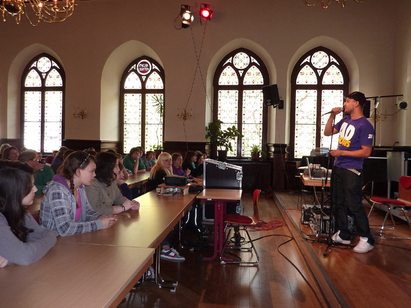 Unterlegt mit aktuellen Hip-Hop-Beats gelang es jedenfalls Doppel-U die 7. u. 8. Klassen für die Klassiker der deutschen Sprache zu begeistern, obwohl für die Schüler unserer Schule in erster Linie die coole lässige Rap-Attüde von Doppel-U im Vordergrund stand. Trotzdem darf man diesen "Deutschunterricht" als durchaus gelungen betrachten. Spätestens bei der Ode „An die Freude“ von Friedrich Schiller "kochte" die Aula und alle Schüler waren vereint in einem großen "Rap-Chor".