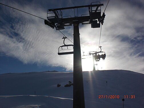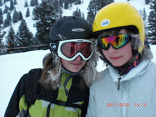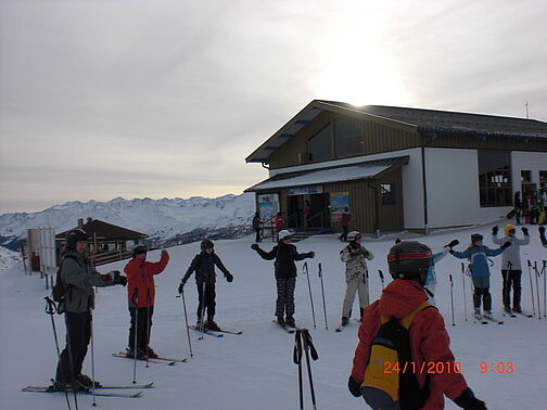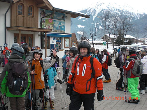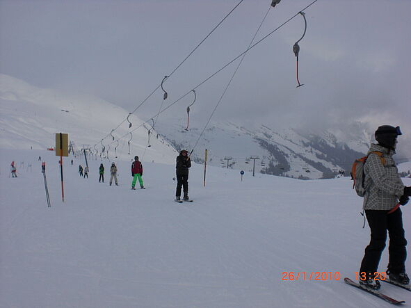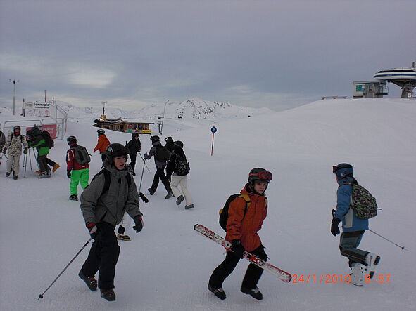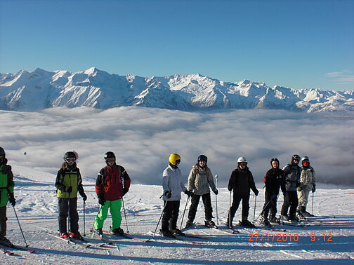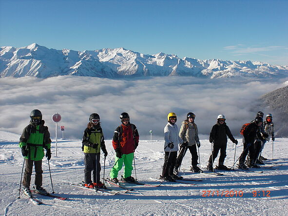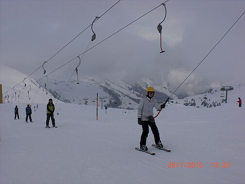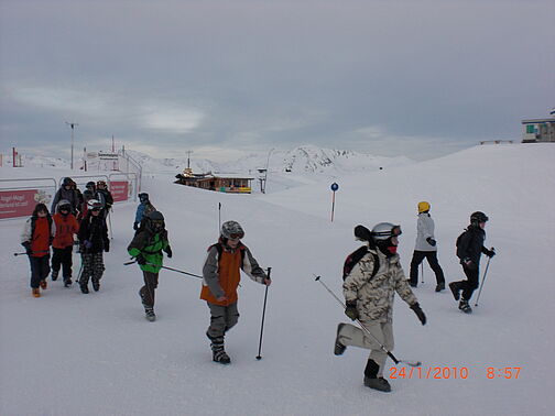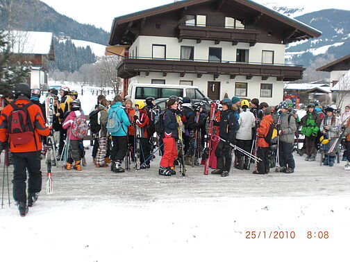 Früh am Morgen standen wir auf, packten unsere Sachen, frühstückten, machten unsere Tagesverpflegung zurecht und stiegen in den Bus, der uns zur Piste fuhr, ein. Ab da hieß es sechs Stunden auf Skiern.