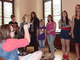 In zwei Gesangsgruppen, je nach Liedvorliebe, wurden nun die Titel einstudiert. Dabei arbeiteten die Schüler sehr selbständig, solistische Abschnitte wurden verteilt und zweistimmige Melodieteile erarbeitet. Zeitgleich hatte die Begleitband die anspruchsvolle Aufgabe, die passende Begleitung zu arrangieren und einzustudieren.