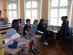 Zunächst ging es an die Auswahl der zu erarbeitenden Lieder. Aus ihren zahlreichen Vorschlägen wählten die Schüler ihre Favoriten: „Halt dich an mir fest“ der Gruppe Revolverheld, „21 guns“ der Gruppe Green Day und ein Lied der holländischen Gruppe Krezip.
