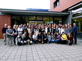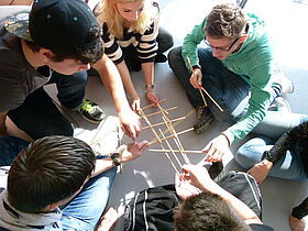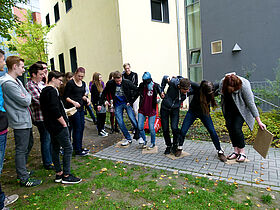 Nach der Ankunft in Heidelberg wurden unsere Schüler gleich mit Schülern aus Rumänien, der Slowakei, Südtirol, Dänemark und den Niederlanden auf die Zimmer verteilt. So kamen schon die ersten Kontakte zustande. Die Kennlernspiele zwangen die Teilnehmer zu viel Körperkontakt und halfen, die neuen Gesichter und Namen schnell zu lernen.